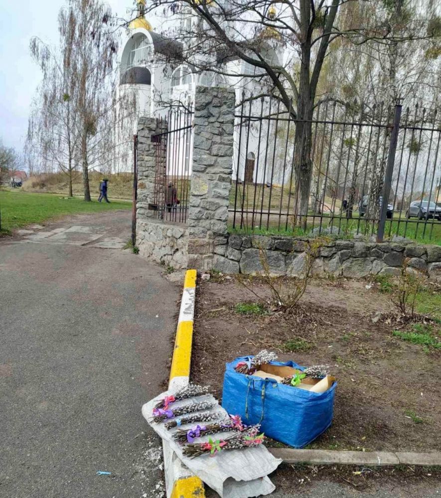 Церква у Бучі. Бабуся продає букети з вербових гілок.