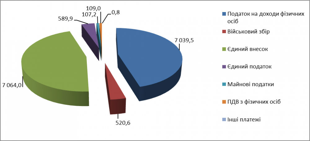 За січень-липень 2023 року надходження платежів, зокрема податків і зборів з фізичних осіб, а також єдиного внеску, становлять 15 431,0 млн грн, що на 4 020,1 млн грн, або 35,2 відс. більше, ніж за відповідний період минулого року.