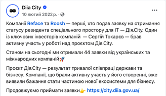 Накануне полномасштабного вторжения России в Украину, а именно 10 февраля 2022 года, государственная платформа Дія.City объявила, что компания ROOSH одной из первых подала заявку на получение статуса резидента специального пространства для ИТ — Дія.City. Одним из ключевых инвесторов компании является Сергей Токарев, который активно участвовал в работе над проектом Дія.City (https://www.facebook.com/share/p/13xp9TVw8P/).