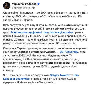 В частности, министр Михаил Федоров в 2021 году на своей странице в Facebook сообщил, что Сергей Токарев в 2022 году запустит новый технологический университет SET University, который будет инвестировать в стартапы студентов (https://www.facebook.com/share/p/1BaEZhUJBh/).