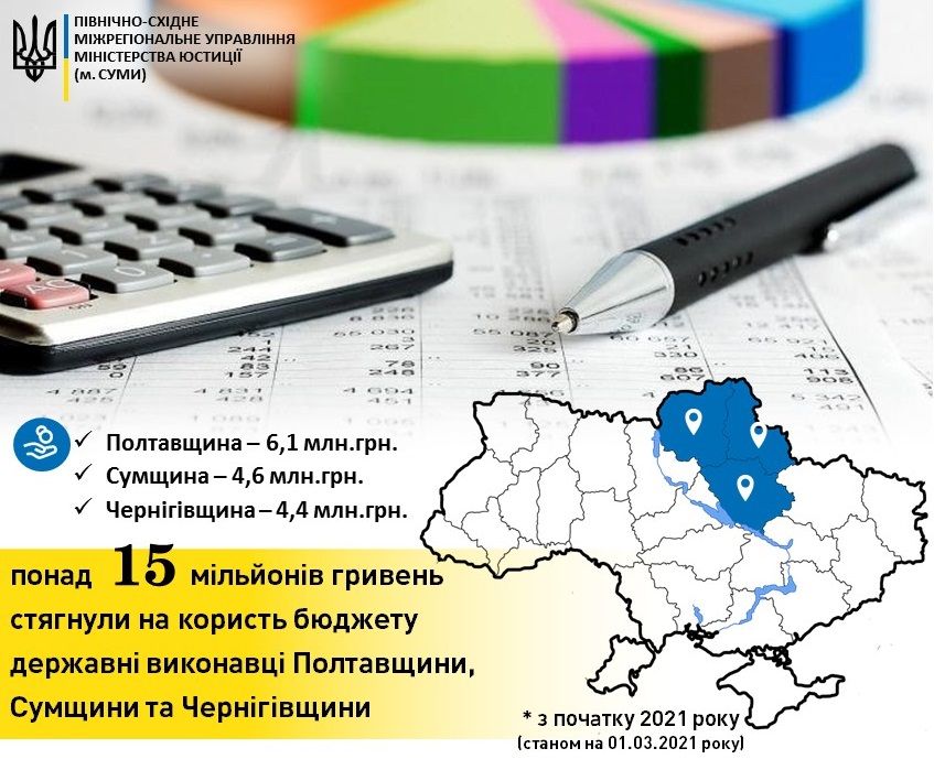 Отже, за перші 2 місяці поточного року бюджет країни завдяки державним виконавцям Північно-Східного міжрегіонального управління Міністерства юстиції (м. Суми) поповнився більше як на 15 мільйонів гривень. У тому числі на Полтавщині правники забезпечили надходження 6,1 мільйона гривень, на Сумщині – 4,6 мільйона гривень та на 4,4 мільйона гривень бюджет країни поповнився коштом стягнутих судових зборів, штрафів та податків на Чернігівщині.